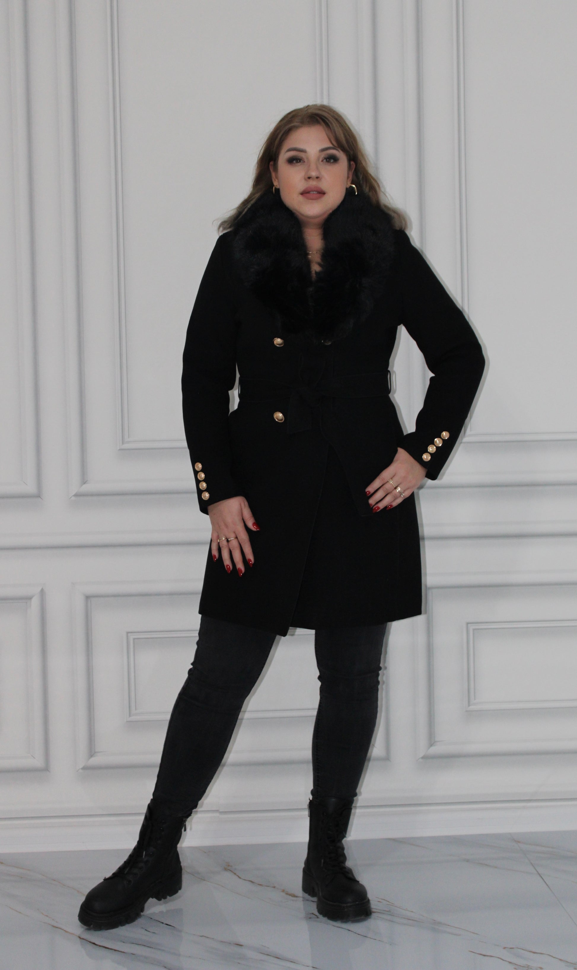 Un palton rafinat, perfect pentru zilele reci, care îmbină eleganța clasică cu confortul modern. Realizat dintr-un material fin și călduros, acest model este completat de un guler amplu din blană ecologică moale, ce adaugă o notă de lux. Talia este accentuată cu un cordon lat, ce se leagă într-o fundă feminină, oferind o siluetă suplă și elegantă. Detaliile aurii de la nasturi completează aspectul sofisticat.