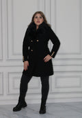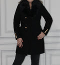 Palton elegant negru cu guler din blană ecologică și cordon în talie